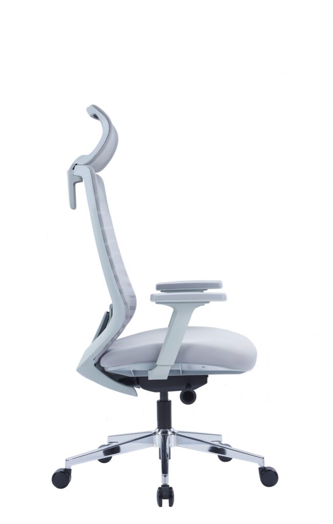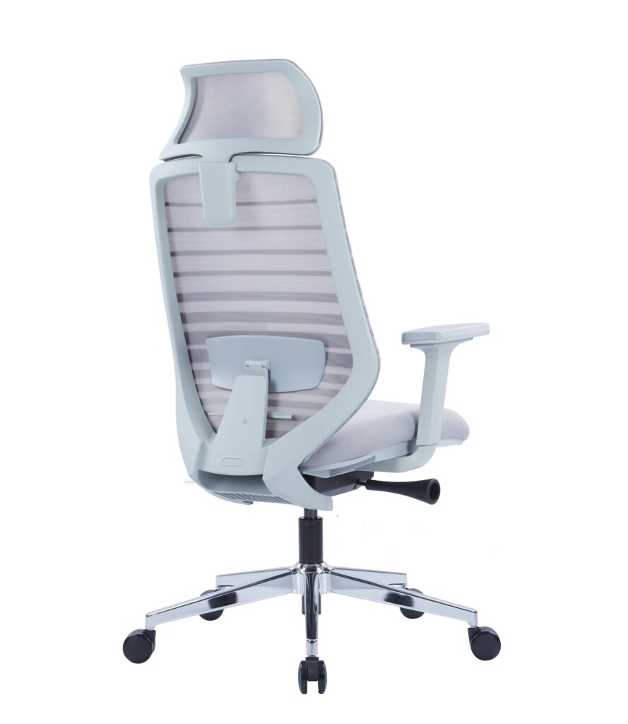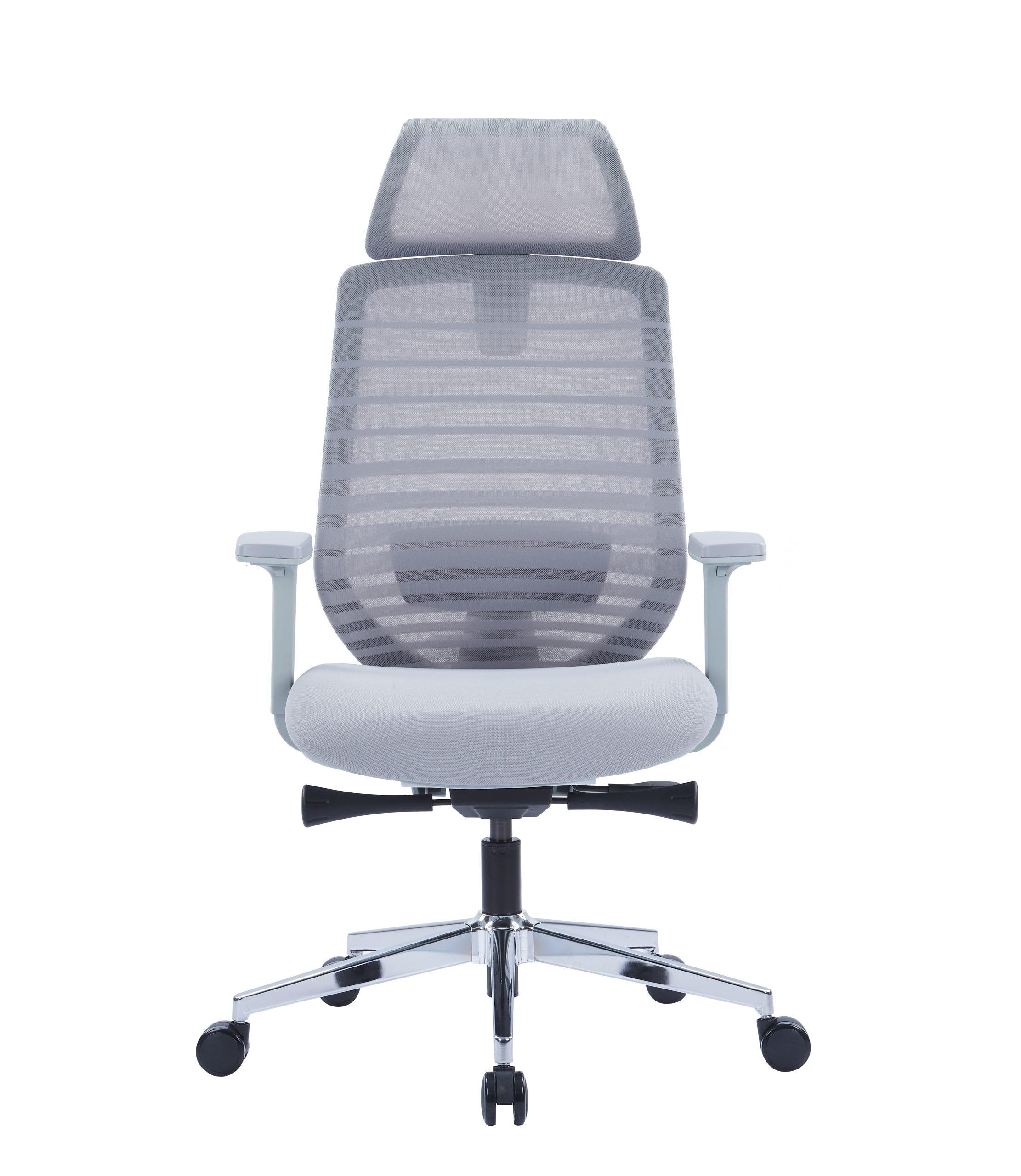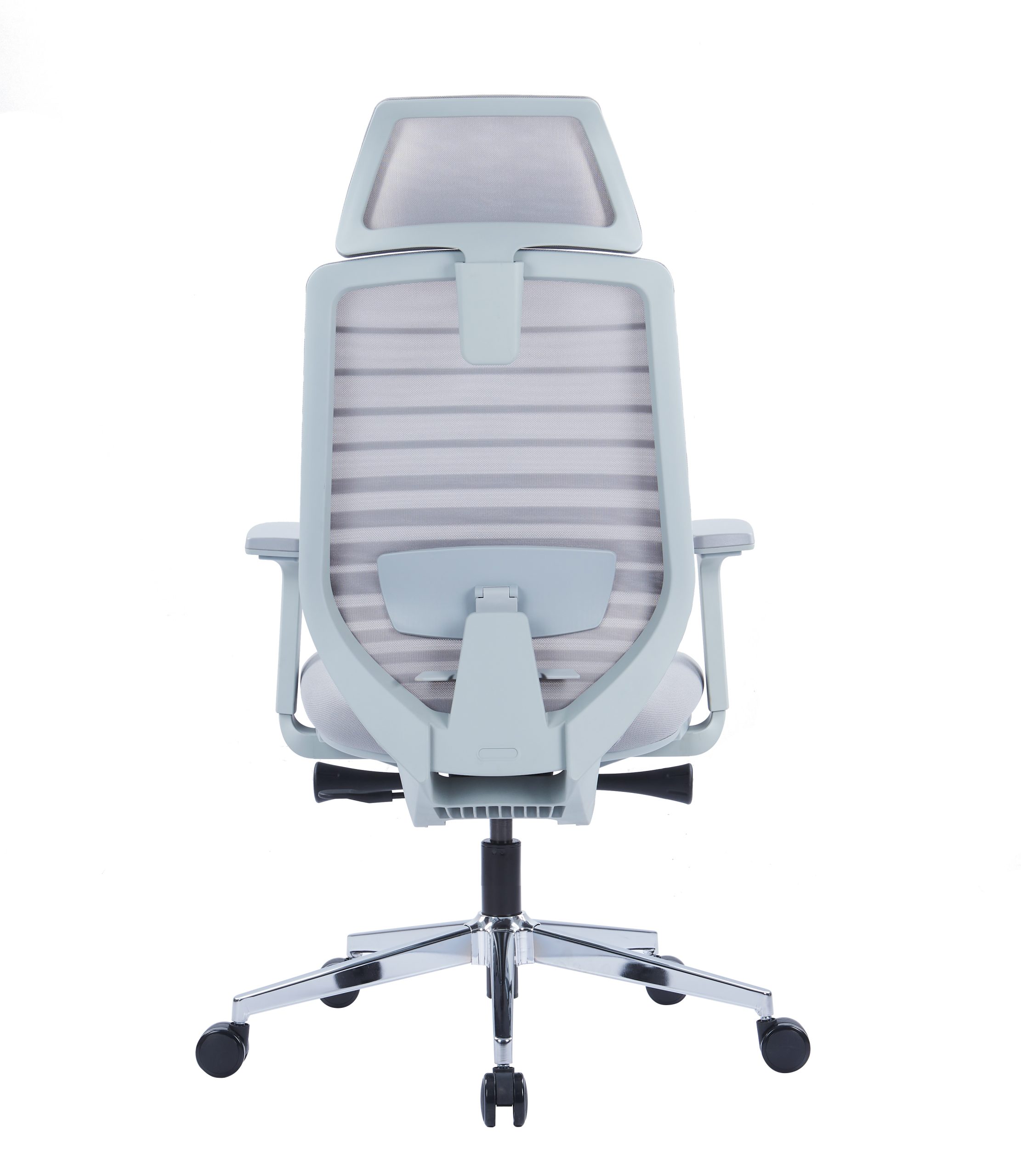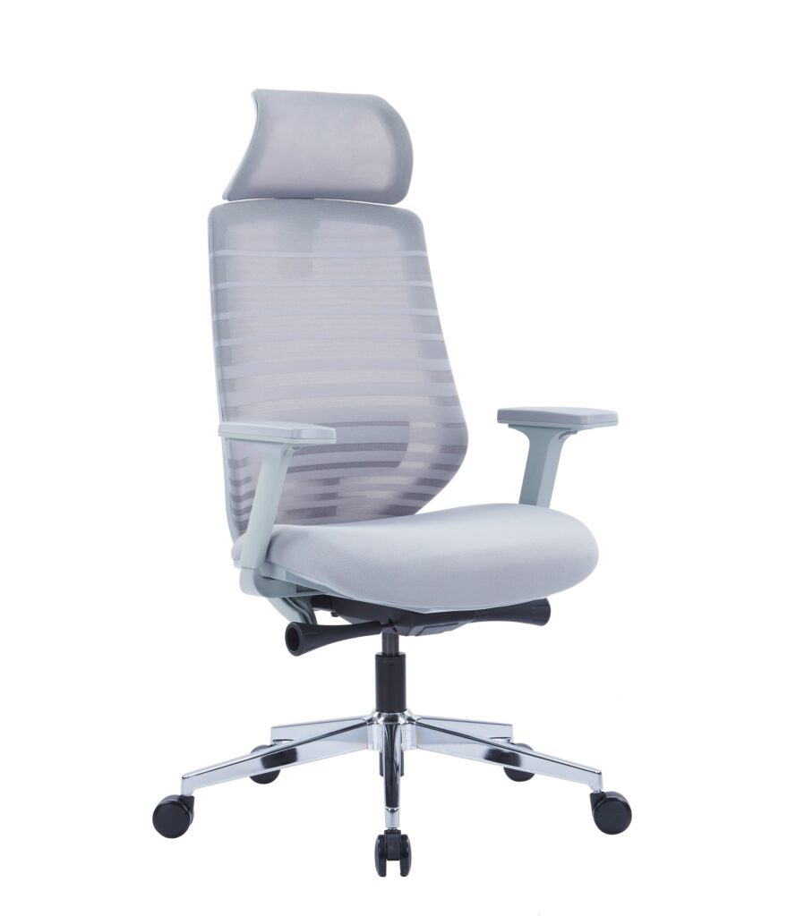 Material: Grey nylon fiberglass chair body, Korean 3D mesh, self-adaptive 3D-PP lumbar support.2D lifting PU armrest.Shaped cotton cushion.Chrome base